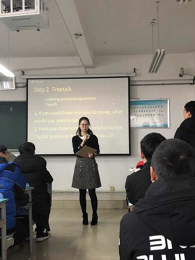 本次课的技能训练焦点是口语能力,共分为五部分。第一部分为Guessing the word from the pictures,即给学生一些图片,对应本单元所学的单词,目的是通过形象的视觉效果将文字记忆与图片记忆结合,帮助学生进行单词记忆和语感培养。第二部分为Free talk,即就本单元hero话题讨论问题,邀请同学分享观点,并陈述理由。目的是有效加强学生英语口语的训练和培养学生综合运用英语的能力。第三部分Presentation,即全班课前准备,三名学生报名课堂展示。用PowerPoint来就heroes in my eyes话题进行。目的是锻炼学生独立学习的能力,锻炼查找资料,总结概述的能力,锻炼其实际演讲的能力,最终促进学生语言应用能力和综合素质的提高。第四部分为Dubbing show,即选取BBC节目“what is a hero”话题的卡通动漫,选取段落,给学生示范原音,使用学习通给学生观看字幕文档,学生进行模拟配音。目的是通过视听说读结合的手段,促进学生英语表达能力的提升。调动学生主动追求高尚品德,利用配音视频的教学功能,来培养学生更深层次的情感。第五部分为Critical thinking,结合以下话题要求学生思考:人民日报的官方微博最近发表了一篇鞍山的一名23岁的消防员为了救一名老人牺牲的故事,成为了一名英雄,而多数网络评论指责老人的行为,就这一话题进行思考并展开讨论。