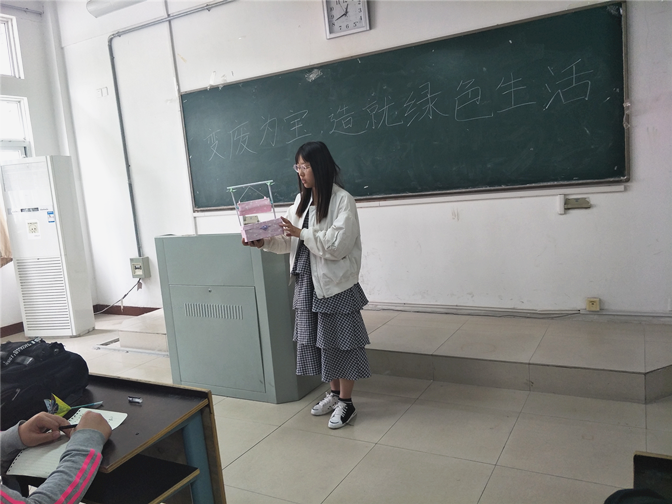 比赛前期,学生会成员通过官网QQ、微博等大力宣传,动员同学们积极参与,总计收到二十副作品。比赛当日,所有参赛选手捧着利用空瓶子、废纸、快递盒子、吸管、易拉罐等生活中常见的废品制成的收纳盒、花瓶、烟灰缸等手工制品达到比赛现场。每位同学按照抽签顺序依次上台介绍展示作品。评委们从环保性、创意性、实用性和美观性四个方面对作品进行评分。最后,来自18翻译班的田嘉裕同学获得本次比赛的冠军。她利用废弃的塑料瓶、废纸制作了精美的收纳盒,盒顶用塑料花加以修饰,设计精巧,分层收纳,可放置化妆品、学生证等物件,简约美观、实用环保,使人眼前一亮。