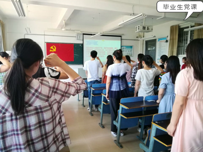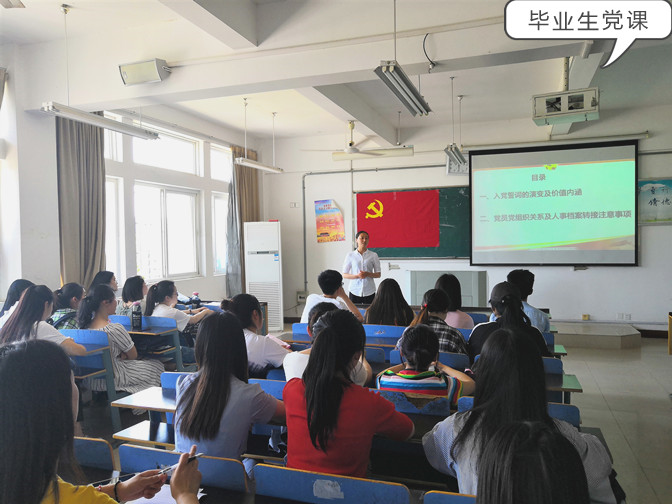 毕业生党课教育:5月23日下午2点,全体毕业生党员在教学楼F505教室,接受了在校期间最后一次党课教育,太阳集团tyc539MACAU党总支书记赵睿,学生支部宣传委员王秀梅老师授课,要求毕业生党员要率先垂范,以身作则,切实发挥党员的先锋模范作用,为毕业生文明离校营造良好的氛围,同时王秀梅提醒广大毕业生党员要按时、按要求将本人党员关系落户,并参加新党组织的各项活动,按期缴纳党费,展现太阳集团tyc539MACAU毕业生党员的良好精神风貌。