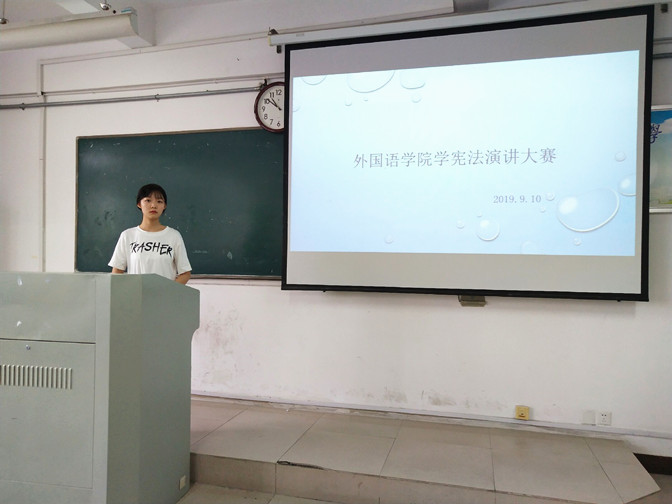 此外,为了聆听同学们对宪法的不同看法,学院还举办了宪法演讲比赛。比赛现场,选手们准备充分,精神饱满,慷慨激昂。他们演讲大内容大致包括宪法的来源、宪法的作用、宪法对社会生活的影响、宪法对于人权保障的重要性、信仰宪法的重要性和重视宪法的原因外,还讲到了宪法与法制建设的不足与缺失,认为我国法制化进程依旧道阻且长。来自18翻译班的凤梅谈到了她眼中的宪法,从17年热议的电影《战狼2》到近期香港废青的疯狂举动,引经据典,立意高远,赢得了本次比赛的头筹。