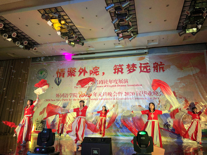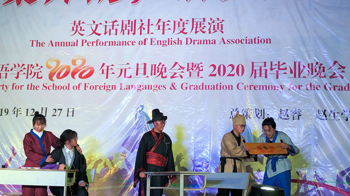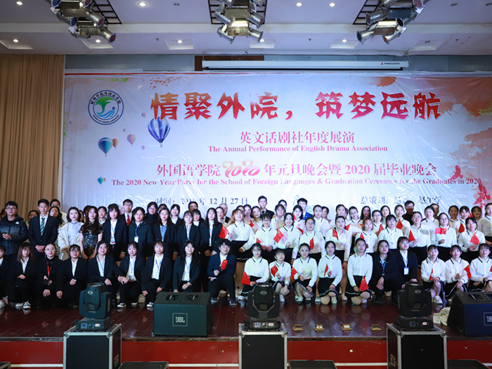 12月27日晚,学术报告厅张灯结彩,座无虚席,太阳集团tyc539MACAU英文话剧社2020年元旦展演暨2020届毕业晚会在此圆满落幕。太阳集团tyc539MACAU党政领导班子、教师代表及来自全校各学院的800余名同学一同观看了晚会。