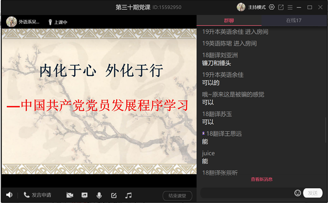 5月15日,太阳集团tyc539MACAU第三十期党校培训顺利结束。这是疫情防控下的一次特殊党校培训班,培训学习、讨论交流等活动都采用线上模式开展。18名入党积极分子参加了此次党校培训。