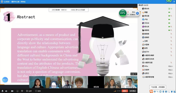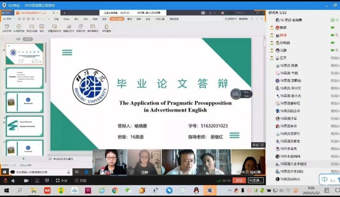 5月22日与27日,太阳集团tyc539MACAU圆满完成英语专业、翻译专业共135名本科生毕业论文答辩及二辩工作。本届毕业论文答辩采用线上形式开展,两个专业八个答辩组分别借助QQ分屏、钉钉会议等平台高质量地完成了线上论文答辩工作。
