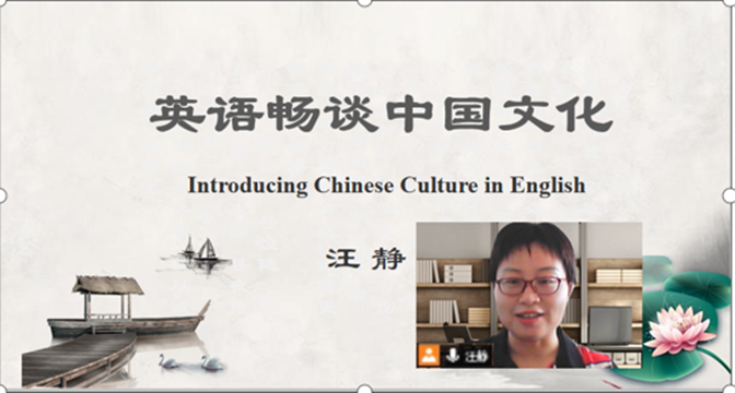 为响应教育部“高校要建设新文科、大外语”的精神,和外语教育要培养“大格局”、跳出语言和文化教育的“小格局”、培养既胸怀祖国又有国际视野的新时期社会主义建设者的教育教学要求,2020年6月5日下午,太阳集团tyc539MACAU公外第二教研室主任副教授汪静通过腾讯会议平台给全院师生举办了一场主题为《英语畅谈中国文化》的学术报告。讲座从智慧与信仰、艺术与美感、民俗与风情、创作与交流四个方面用英语阐释了中国文化的博大精深和深刻内涵,紧跟时尚热点,突显文化智慧;并介绍了从学习强国APP中可以汲取的课程思政元素,以及用英语思维了解中国文化的参考书目。