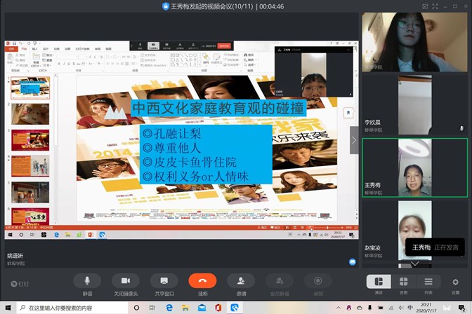 经过前期的筛选,共10位同学加入了英文配音秀组。与以往不同的是,本次活动吸收了三名理工科学院的同学参加,突破了学科背景的限制。配音秀组共开展四次线上理论指导课,帮助学生深刻感知跨文化情景和跨文化冲突给人们带来的巨大生存压力。指导教师筛选了5部作品,分别为《沙漠之花》《推手》《喜福会》《洋妞到我家》及《刮痧》,作品紧扣跨文化冲突的主题。参加学生两两一组,选择一步电影,反复观看,思考揣摩,在充分理解作品的基础上选择片段,开展配音秀活动。