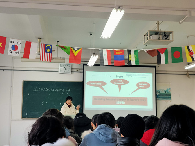 在示范课Heroes of Our Times环节,吴沛瑾老师从Super Hero(超级英雄)、First Responder(现场急救员)、Civilian Hero(平民英雄)三个维度,环环相扣,阐释了疫情期间最美“逆行者”的深刻内涵,对Hero的课程思政元素进行了深入挖掘和升华。线上线下+翻转课堂+移动教学的智慧课堂教学形式,使得课堂教学气氛活泼、互动融洽,取得了良好的教学效果,受到科技学院同仁的高度评价。