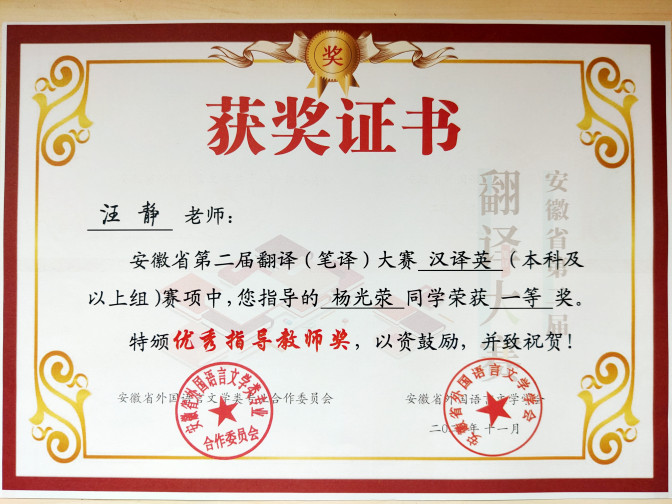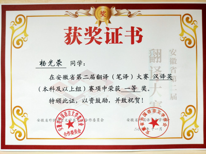 为满足新时期日益扩大的语言服务人才需求,助力国家“一带一路”倡议实施,促进翻译学科建设和语言服务行业繁荣发展,本着“以赛促学、以赛促练”的原则“培养人才、发现人才”,由安徽省外国语言文学类专业合作委员会和安徽省外国语言文学学会联合主办的安徽省第二届翻译(笔译)大赛于近日圆满落幕。我校18翻译的杨光荥同学在汪静老师的指导下,经过初赛和复赛的层层选拔,一路过关斩将,荣获安徽省第二届翻译(笔译)大赛汉译英(本科及以上组)一等奖第一名,创造了我校在该项赛事中的最好成绩!
