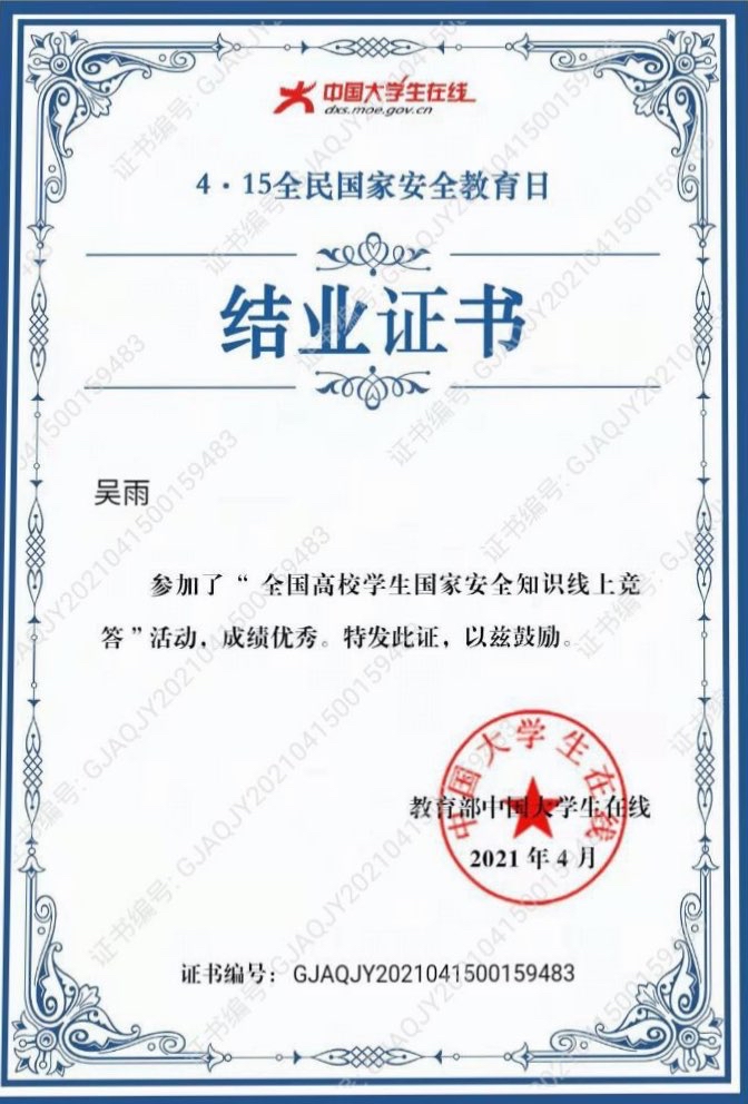 组织学生通过微信搜索“中国大学生在线”订阅号,点击菜单栏“国家安全”参与竞答游戏,并通过线上竞答活动获取中国大学生在线颁发的题为“4.15全民国家安全教育日”结业证书,据统计,外国语学生参与率与取得证书率超过80%。