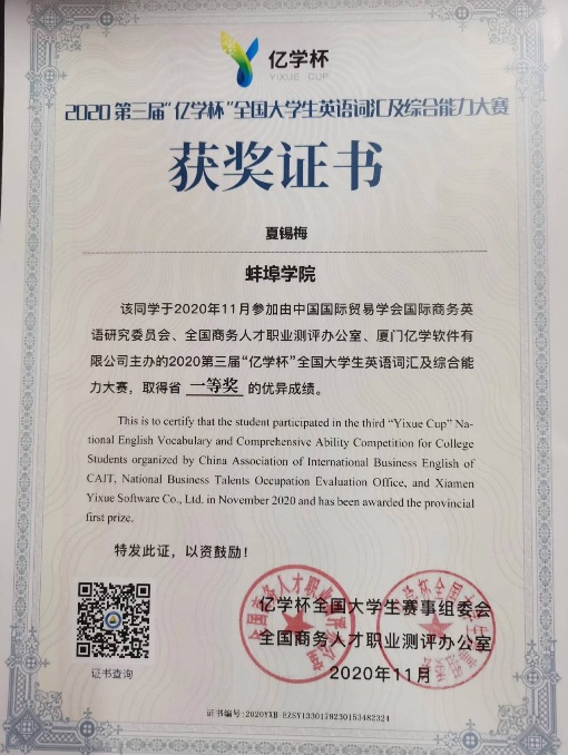 夏锡梅,17翻译专业学生,目前已被安徽大学录取。 |