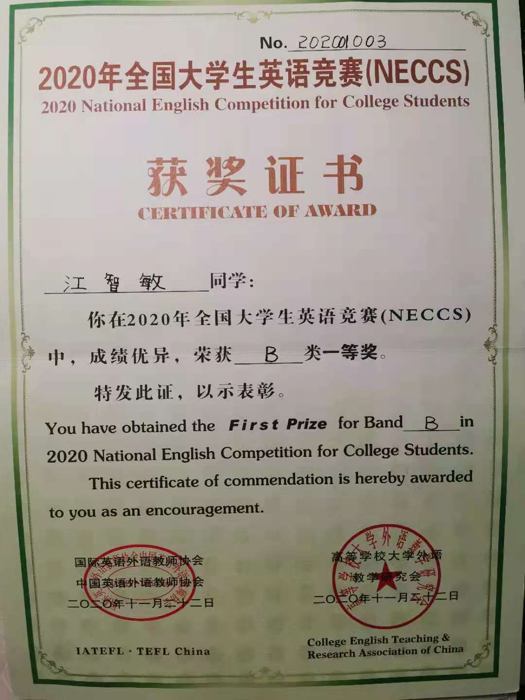 陈诺,19英语(升本)专业学习委员,获得校二等奖学金,目前已被南京师范大学录取。