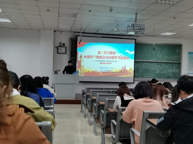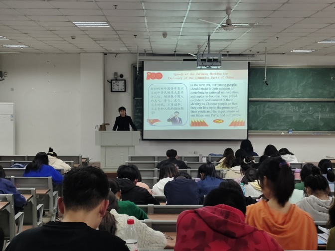 授课过程中,卢洁首先对习近平总书记“七一”重要讲话内容进行双语介绍,并从中英文两种语言角度进行语言结构分析,引导大家从双语不同语境学习领会讲话精神。接着,卢洁带领学院从庆祝、回顾、展望的时间线梳理“七一”重要讲话内容的脉络,双语讲授回顾党过去一百多年的辉煌历史,详解详学“七一”重要讲话的内容,并将党的专有名词的英语解读穿插其中,以紧扣专业学习特点的方式使学员们深化对建党精神的认识,坚定了不负韶华、不负党和人民殷切希望的决心。最后卢洁以“风声雨声读书声,声声入耳;家事国事天下事,事事关心”勉励学员牢记初心使命、坚定理想信念。