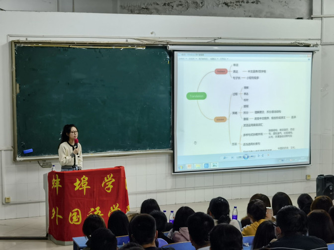 针对大一新生对四六级考试了解较少、应试技巧相对薄弱的具体特点,郭嵘老师给着重讲解了试卷的构成,对解题方法进行分项指导;在写作能力考核环节,郭老师制作思维导图来为同学们启发思维,强调应试应注意的细节问题,使同学们对考试题型及考核的基本能力有了直观了解,为提升备考效率奠定扎实基础。