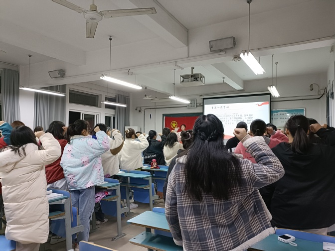 重温入团誓词。“我志愿加入中国共产主义青年团,坚决拥护中国共产党的领导……”,在郑重庄严的誓词中,支部团员强化了团员意识,增强了个人对团组织的认同感和归属感。团员们高举右手,紧握右拳,再次郑重地宣誓,宣誓铿锵有力,慷慨激昂。团员们举起的右手紧握的是共青团员的忠诚,专注的目光凝聚着共青团员的坚定。教室里回荡的神圣庄严的入团誓词,仿佛又让在场的全体共青团员回到了入团时那令人激动而又难忘的时刻,共青团员要勤奋学习,吃苦在前,享受在后,为共产主义事业而奋斗的信仰再一次得到了升华。