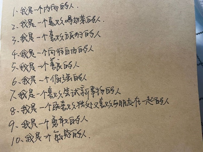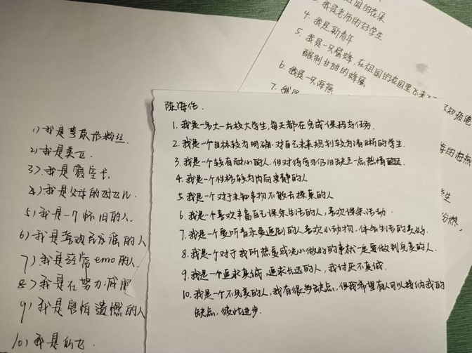 活动采用游戏的形式,让大家在几秒中的时间内写下10个“我是…”的句子。在心理咨询老师的指导下,每个人都积极参与,在纸上写下自己对自己的看法。在场同学进行互动交流。有的同学写到我是一个目标明确的人、有耐心的人、性格安静的人,有的同学写到我是一个喜欢尝试新事物的人、勇敢的人。不同的人有不同的答案,每个答案都体现了个人鲜明的特征。通过一个简单的方法,几个简单的句子来帮助大家认识自己眼中的我及心中的我。