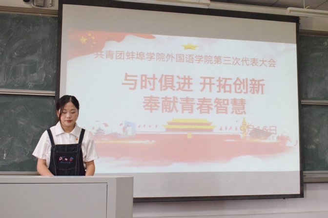 大会在庄严的国歌声中拉开帷幕。王娜娜从“思想引领、组织提升、素质拓展、权益服务”等方面汇报了共青团工作。黄灿肯定了学院共青团工作,并对下一步发展提出希望,强调要做到“三要”:一要充分发挥共青团党的助手和后备军作用,不断增强组织先进性;二要立足专业特色,积极开拓创新,打造学院品牌;三要不断提高同学们团学活动参与热情,进一步发挥团学活动对青年学生提升综合素质、成长成才的重要作用。