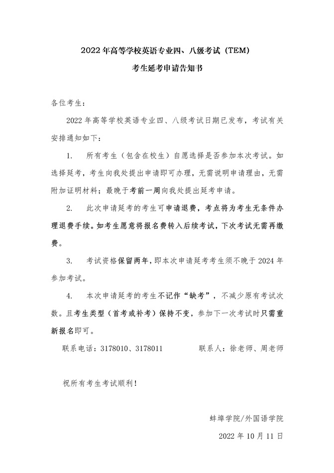 公告-2022年高等学校英语专业四、八级考试(TEM) 考生延考申请告知书
