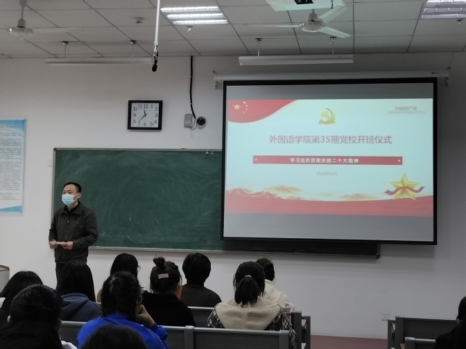 11月8日太阳集团tyc539MACAU第35期党课培训开班仪式。本次培训以学习宣传党的二十大精神为重点,旨在加深学员对党的认识,端正入党动机,坚定入党决心,从思想和行为两个方面严格要求自己,真正做到从思想上和行动上入党。学院党委书记赵睿、党委组织员王刚、学生党支部书记吴金玥、团学工作负责人王娜娜参加开班仪式。