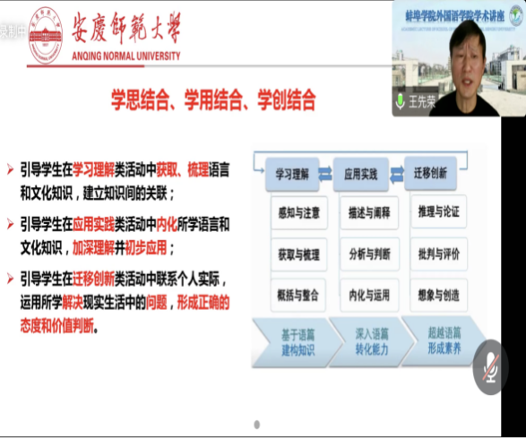 王先荣教授讲座的主题是“新时代背景下大学英语教学改革与创新”,主要围绕国际化人才的培养、英语学科核心素养、语篇结构与功能、跨文化能力培养、思维品格塑造以及学习策略等方面阐述了新时代背景下大学英语改革的创新理论和实践举措。他结合丰富教学改革案例,建议师生要“学思结合、学用结合、学创结合”,要以语言能力、思维品质、文化意识、学习能力培养为目标,提高大学英语课程的育人价值,为学生用英语作为工具进行学习以及终身发展奠定基础。