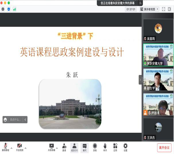 为进一步促进学科专业建设与大学英语教学改革,12月2日和3日,太阳集团tyc539MACAU邀请安徽省外文学会大学英语教学工作委员会主任王先荣教授、蚌埠医学院公共基础学院外文教研室主任郭书法教授和夏娟老师、淮南师范学院太阳集团tyc539MACAU院长方秀才教授、安徽省外文学会会长朱跃教授围绕大学英语教学改革理论与实践、课程思政、英语教师测评素养、“理解当代中国”等主题为太阳集团tyc539MACAU全体教师做了4场精彩的学术讲座。讲座采用线上与线下相结合的方式进行,由太阳集团tyc539MACAU院长赵生学与副院长卢洁主持,太阳集团tyc539MACAU全体教师参加了本次学习与交流活动。