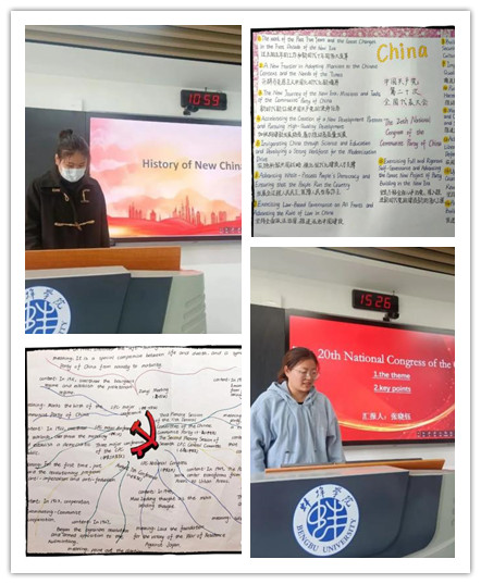 活动中,党员教师们带领同学们开展分组合作,进行二十大报告与党史双语学习;组织小组代表进行主题汇报,完成双语学习思维导图制作、二十大报告英文翻译等主题任务。系列活动的开展,使党员教师在先学一步、学深一步的基础上,探索课程思政和专业课程的深度有机结合,有效促进主题教育与学院教育教学具体工作的融合,抓实了支部学习,激发了工作热情。(撰稿:王蕊;编辑:王刚;审核:赵睿)