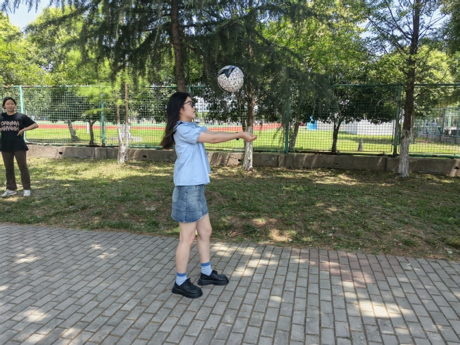 此次比赛规则为在特定的区域范围内,各参赛选手在一百秒时间内采用双手垫球方式进行,要求垫球高度过头,比赛过程中可有停顿,最后按照垫球数量进行排名。比赛开始前,各参赛队员到达位置后进行短暂的练习。正式比赛时,参赛队员们眼神专注,目光紧盯上下跳动的排球,使出浑身解数完成击球,当球落地或者被击飞,选手们迅速将球捡起并调整状态再次开始,比赛有条不紊地进行着。赛场内,裁判员组织秩序井然,赛场外,其他比赛选手也在相互鼓劲加油。激情与欢乐同在,友谊与比赛共存。最终,杨丽君同学以100秒垫球157次获得本场比赛第一名。