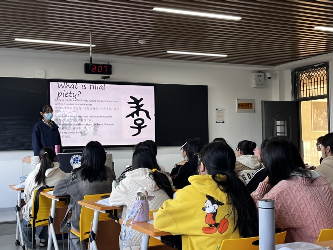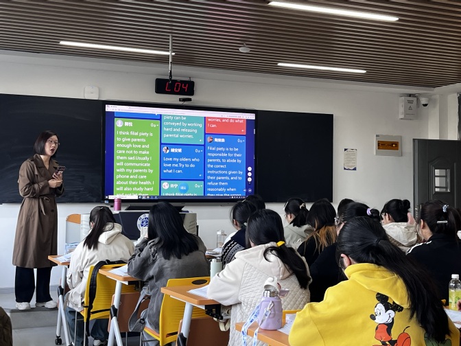 本次公开示范课授课对象为文学与教育学院2023级汉语言文学3班。傅静玲老师以《新视野大学英语读写教程1》第二单元翻译练习“Filial Piety(孝道)”为主题,采用线上线下混合式教学手段,课前通过学习通发布问题讨论及小组任务,引导学生围绕“孝道”文化概念展开讨论,小组合作完成“孝道”故事PPT制作;课上结合学生的讨论结果以及“孝道”文化故事讲述,拓展与主题相关的翻译词汇,引导学生深入理解该主题。授课过程中,学生充分参与课堂,课堂气氛活跃,教学效果良好。