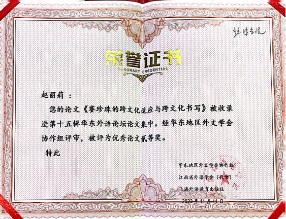 在本次论坛上,汪静的《多平台混合式大学英语线上教学模式》和赵丽莉的《赛珍珠的跨文化适应与跨文化书写》成功入选第十五辑华东外语论坛论文集,其中《赛珍珠的跨文化适应与跨文化书写》在优秀论文评选中荣获二等奖。(撰稿:赵丽莉;编辑:王刚;审核:赵睿)