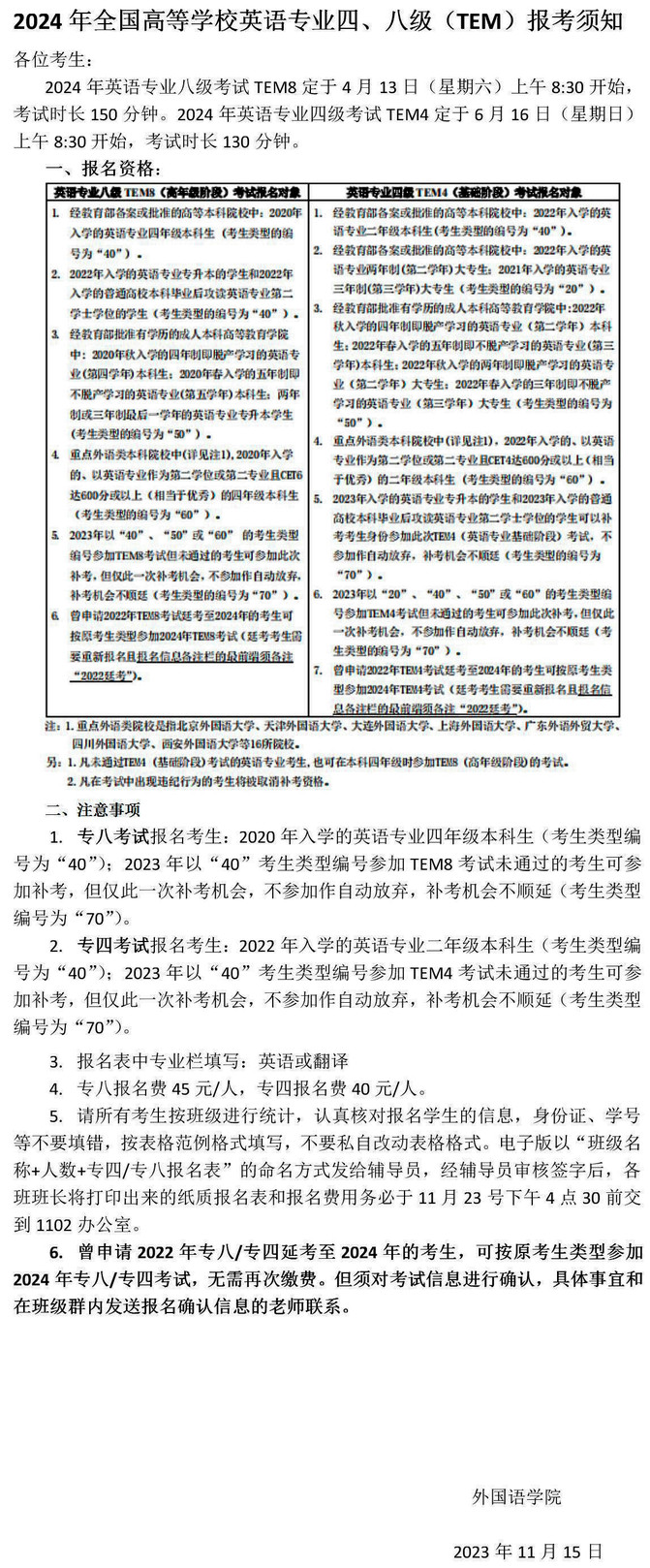 公告-2024年全国高等学校英语专业四、八级(TEM)报考须知--太阳集团tyc539MACAU