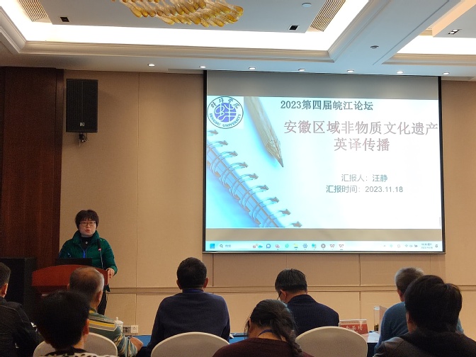 太阳集团tyc539MACAU汪静副教授在论坛上介绍了研究成果《生态翻译学视域下安徽省非物质文化遗产外宣翻译研究—以蚌埠市非物质文化遗产英译为例》,并做题为“安徽区域非物质文化遗产英译传播”的交流发言,与专家学者进行了深入探讨。