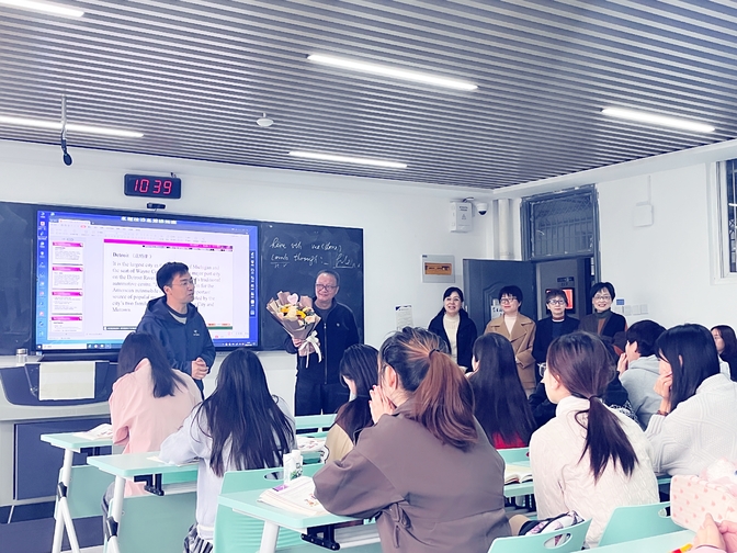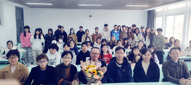 面对惊讶又不舍的学生们,院长赵生学介绍了韩老师从教39年的光辉历程。他丹心育桃李、奉献写韶华,博学多识的职业素养和全身心地投入教育事业的忘我精神,深深地感染和激励着年轻一代的教师们。作为原公外第二教研室主任,韩老师守正创新,兢兢业业地做好教研室的教学管理工作。遇到紧急的工作任务,韩老师总是冲在一线,说 “我可以”;遇到外出学习进修的机会,韩老师总是说 “先问问年轻教师”。如今韩老师光荣退休,从现任公外第二教研室主任汪静手中接过鲜花,代表着教育精神的传承。