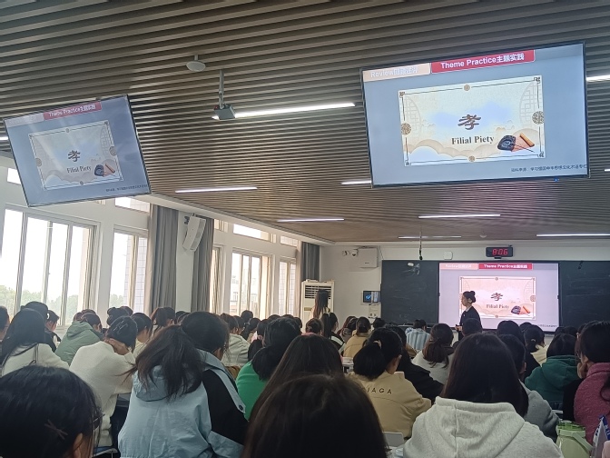 公开课以应时的中国传统文化二十四节气之立冬开场,师生互动讨论立冬的习俗,引出家庭成员间的互通及关系。教师搭建教学“脚手架”,启发学生思考,无论在古代中国,还是当代中国,父母与子女之间的关系都被认为是人类最重要的关系,引出本节主题——孝(Filial Piety)。在学习强国APP《中华思想文化术语专栏》中“孝”主题内容的基础上,任课教师列举相关翻译内容及翻译策略,启发学生进行翻译实践运用。学生通过对《游子吟》英文版本的学习,认识到孝亲文化是培养个人责任感的重要途径。在总结部分,教师引用了“四世同堂”的家庭纽带故事与习近平总书记关于家庭教育的讲话,使学生们意识到,孝亲文化是社会和谐的基石,它并不仅仅局限于家庭,更延伸到社会和国家,强调的是一种回馈和奉献的精神,引导我们感恩父母、尊敬长辈、报效祖国。