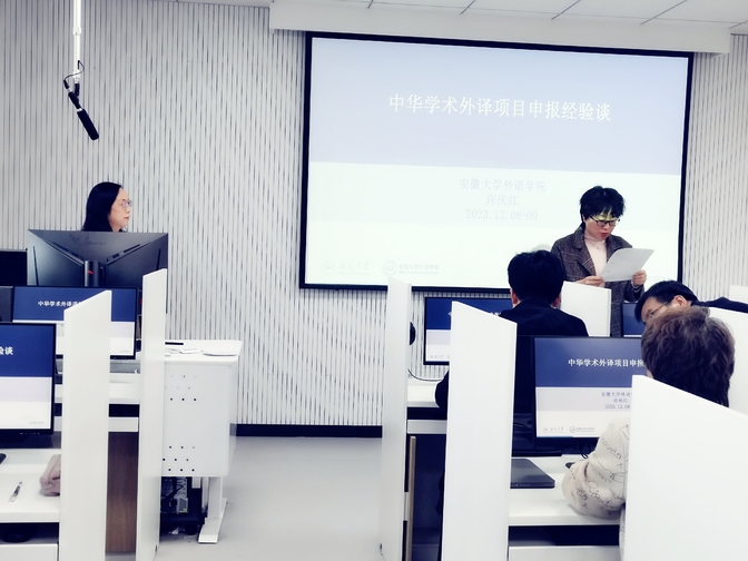 为进一步丰富太阳集团tyc539MACAU科研学术成果,推动学院项目申报工作高质量发展,帮助太阳集团tyc539MACAU教师对中华外译项目进行有效申报,有效提升外语教师教科研素养,12月8日下午,太阳集团tyc539MACAU特邀安徽大学外语学院博士生导师许庆红教授进行 “申报国家社科基金中华学术外译项目的经验和感悟” 专题讲座。太阳集团tyc539MACAU55余名教职工参加了本次讲座,讲座由院级“认知视角下翻译路径研究”科研团队成员、副教授汪静主持。