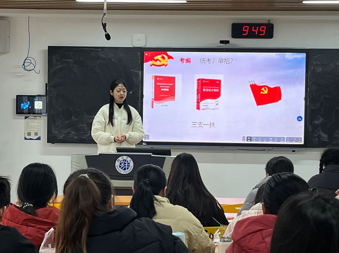 20级学生党员倪慧从考研、考公、考编、校招,四个方面分析职业发展方向。她给同学们详细讲解考编的准备过程,包括报考、备考、复盘以及心态调整等方面的要点。建议想考研究生、教师、选调生、西部计划的同学应该早选择、早备考、早准备。