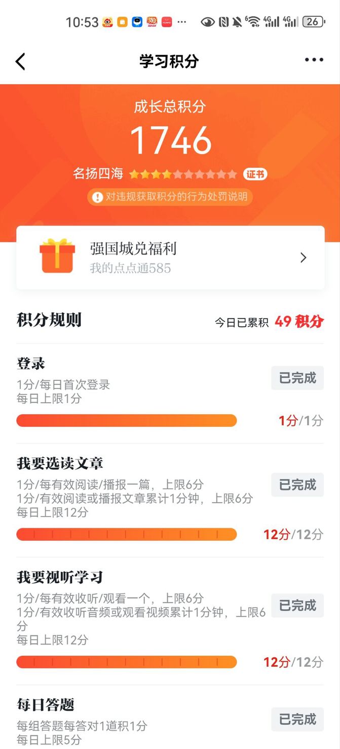 本次活动是以深入学习贯彻党的二十大精神、宣传领悟习近平新时代中国特色社会主义思想为主线,提高学生党员政治素质和综合能力水平为目的。本次学习强国打卡活动以“学习强国”软件的学习积分为依据,参与活动的党员每天在学习强国APP上通过视听学习,选读文章,参与答题等形式了解时政新闻、学习先进理论并获得积分。活动实行周通报、月汇总机制,每周进行数据更新总结并公示,让每一位党员都有参与感和获得感。活动开展期间,支部学生党员日均积分均高于40,学生党员刘振林、施露雨学习成绩突出。本次活动使学生党员们充分发挥手机端学习强国APP口袋课堂的作用,更加深入学习习近平新时代中国特色社会主义思想,进一步提高了自身的理论素养和实践能力。