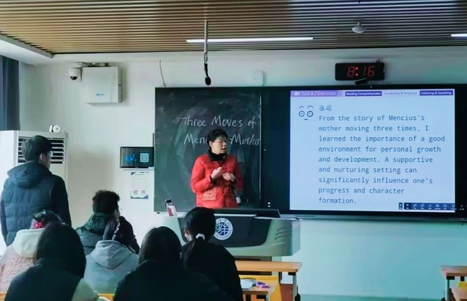 本次公开课主讲课程为《大学英语Ⅱ①》Unit 2 “The Day She Became a Mom”(她成为妈妈的那天)。在讲授环节,曹帅从讲故事切入,讲述孟母为了给孩子营造一个良好的成长环境,三次搬家定居在学宫附近,使孟子得以接触和学习到礼仪等知识的“孟母三迁”的历程,展现孟母对孟子深厚的母爱、对教育的重视和对孩子未来发展的远见;引导学生们从感恩母爱的角度思考这一故事,孟母为孟子选择居住环境考虑的并非自己的舒适和便利,而是孩子的成长和未来,这种无私的爱和奉献精神,值得每一个人去感恩和珍惜。在“感恩母爱”主题讨论环节,曹帅引导同学们分享自己与母亲相处的点滴回忆,表达了对母亲深深的感激之情。许多学生表示,通过这次课程的学习,他们更深刻认识到了母爱的无私和伟大,也更加珍惜与母亲相处的时光。在课堂总结环节,曹帅表示感恩是中华民族的传统美德,更是每个人应该具备的基本素养。通过本次课程的学习,希望学生们能够真正理解母爱的伟大和无私,学会感恩和回报母爱,成为有孝心、有家庭责任感的人。