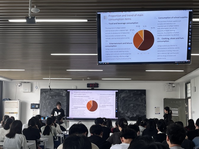 通过课前学情调查,任课教师发现学生对课文主题的理解和结构逻辑的把握存在不足,且对消费与储蓄的选择存在疑惑。针对这些问题,在课程导入部分,教师首先向学生们反馈了问卷调查情况,明确了本节课的教学目标和预期效果。随后,通过播放学生录制的校园采访视频,展示了当代大学生消费观和职业观的多样性,邀请学生详细分析了问卷调查结果,揭示了当代大学生消费观的主要特点。