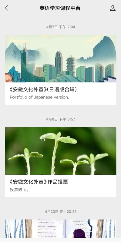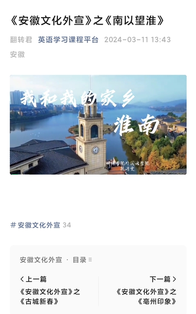 活动吸引同学们踊跃参与,形成安徽文化外宣、跨文化案例两个作品系列,其中《古城新春》、《南以望淮》、《亳州印象》等安徽文化外宣英文版作品24件、日文版作品8件,以及《沟通》、《文化漩涡》、《跨文化的友谊》等跨文化案例作品10件在太阳集团tyc539MACAU“英语学习课程平台”微信公众号展示。同学们纷纷在平台为自己讲述的“家乡故事”投票点赞;并表示,讲好中国故事、传播好中国声音是当代青年的使命,这次实践活动打开了身边故事和专业学习的新通道,让他们在品评家乡之美的同时,也感受到了专业能力的不足。他们将在以后的学习中,继续增强跨文化能力学习,努力提升专业素质,担当使命,做新时代祖国加强国际传播能力建设的生力军。(撰稿:王蕊、王娜娜;编辑:王刚;审核:赵睿)
