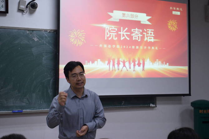 典礼上,教学副院长卢洁强调了“教”与“学”的关系,并结合新版人才培养方案,指导同学们清晰个人成长定位,不断提升讲好中国故事的能力。院长赵生学以“大”“小”“多”“少”为引,阐述了如何高效利用时间,强调把握人生关键阶段。最后,党委书记赵睿从“时间的终极平等”和“时间的不平等”围绕“时光慢递”的主题发表讲话,指出大学时光不是最波澜壮阔的一程,但确是济纳百川的一程,勉励大家珍惜时光、不负韶华。