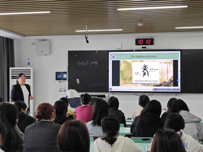 本次公开示范课分三个模块进行:课前导入、标题解析、课文结构分析。肖老师首先以主题讨论“家的含义”导入教学内容,让学生阐释他们对家的理解,通过两个关于家庭和母爱的视频,引导学生理解我们从家庭中获得温暖、爱、支持、包容的同时,也要担负起家庭的责任。孝道在中国传统文化中占有重要地位,肖老师通过古汉字“孝”的字形解析视频带领学生探讨孝道的含义和内容以及在新时代背景下如何对孝道进行传承和创新。接着,肖老师对文章标题进行分析,紧扣“child”和“adult”,让学生聊聊从童年到青少年再进入成年阶段,和父母之间的关系经历了怎样的变化,尤其是青春期的亲子关系。通过一系列的课堂活动,让学生对父母的爱以及自己在家庭中的角色有了更清晰的认知。整堂课的教学设计环环相扣,教学过程中肖老师引导学生积极思考自己与父母及家庭的关系,课程思政与单元主题如盐入水,有味无形。运用多种教学手段,突出以学生为本的理念,积极培养学生的综合素养。