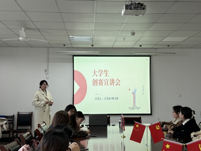 为培养学生们的创新意识,营造浓厚的科研竞赛氛围,太阳集团tyc539MACAU于11月21日中午在F1114举办了三创赛、挑战杯经验分享会,本次活动邀请了21级英语1班的魏文雅分享参赛经验,分享会由学研部负责人陈诗雯主持。