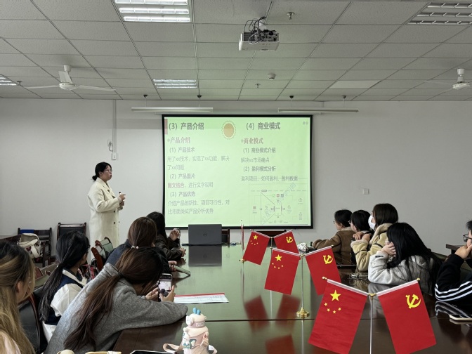 会上,魏文雅同学结合自己的参赛经历和同学们分享对创新创业大赛的深度理解,内容涵盖七个关键部分:大赛介绍、备赛流程及时间线、组队策略、选题方向、计划书与PPT构思、PPT制作技巧以及资源分享。她首先阐述了A类与B类赛事的不同点以及各自的主办单位,指出三创赛旨在激发大学生的创新创业热情,为国家经济的发展注入新的动力。随后,她详细解读了大赛的流程,说明了目前初赛选拔出优秀的创业项目,决赛中由评委们综合考量项目的创新性、实用性及市场潜力,以确定最终的优胜者的基本过程。魏文雅还和同学们分享了跨学科的团队组合的优势,强调团队成员间的优势互补,并指出参赛者在比赛中应展现出的团队协作和沟通技巧。在分享会的尾声,她鼓励学弟学妹们踊跃参与创新创业大赛,以此为契机锻炼自身能力,提高综合素质。