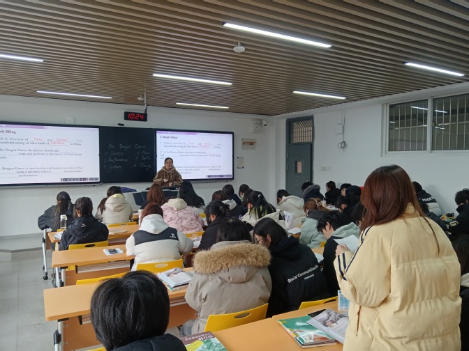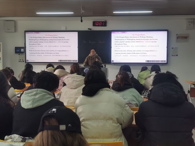 此次课程根据《大学英语II①》的课程内容,将传统舞龙文化与翻译教学紧密融合,吸引了艺术类学生的踊跃参与。课堂之上,任课教师根据舞龙的中英双语版本,讲述这一极具代表性的中华文化符号。依据文章段落,分别从舞龙的地位、表演特色、文化内涵、多种形式、当代的舞龙以及舞龙象征意义的转变六个方面介绍了这个极具中华民族特色的民间舞蹈。