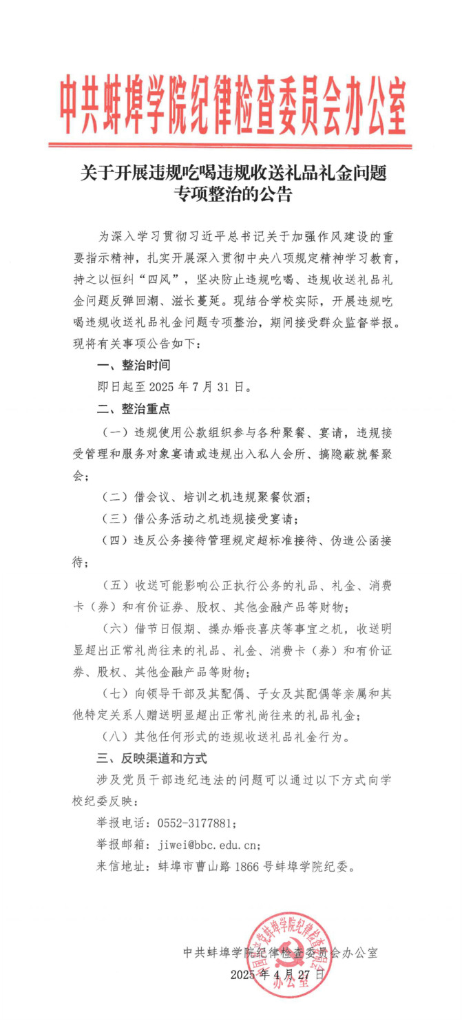 关于开展违规吃喝违规收送礼品礼金问题专项整治的公告