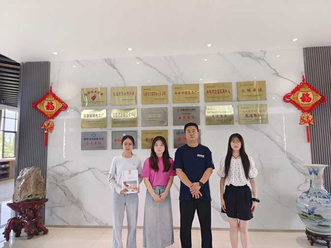 为推进英语专业升级改造,深化产教融合,6月17日,太阳集团tyc539MACAU教师徐善文带领三名学生前往安徽省徽玻玻璃股份有限公司开展企业认知实践活动。公司办公室李主任和外贸部陈经理热情接待师生一行,并围绕产品生产、外贸业务及跨境电商发展进行了深入交流。师生实地参观了生产线,了解玻璃制品出口流程,同时收集企业资料,为后续开展跨境电商直播实训积累素材。