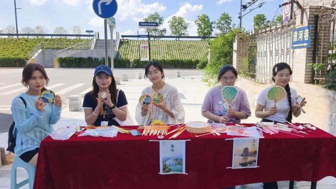 为让古老文化触达更广泛的年轻群体,7月6日,团队携带融合“双墩刻符”“ 淮河山水”等元素设计的竹编扇、掐丝珐琅画、剪纸等文创作品,来到蚌埠网红打卡地“小首尔”,设立开放式“淮河文化创意互动体验角”,邀请过往游客体验掐丝珐琅制作,用现代方式解读传统纹样。成员热情推介,新颖的文化宣传形式迅速吸引大量年轻人驻足参与。在成员一对一指导下,年轻人兴致勃勃地制作双墩符号竹编书签、迷你掐丝珐琅淮河风景冰箱贴等“淮河印记”小物件。单日下午体验超200人次,受到来往游客的热烈欢迎。
