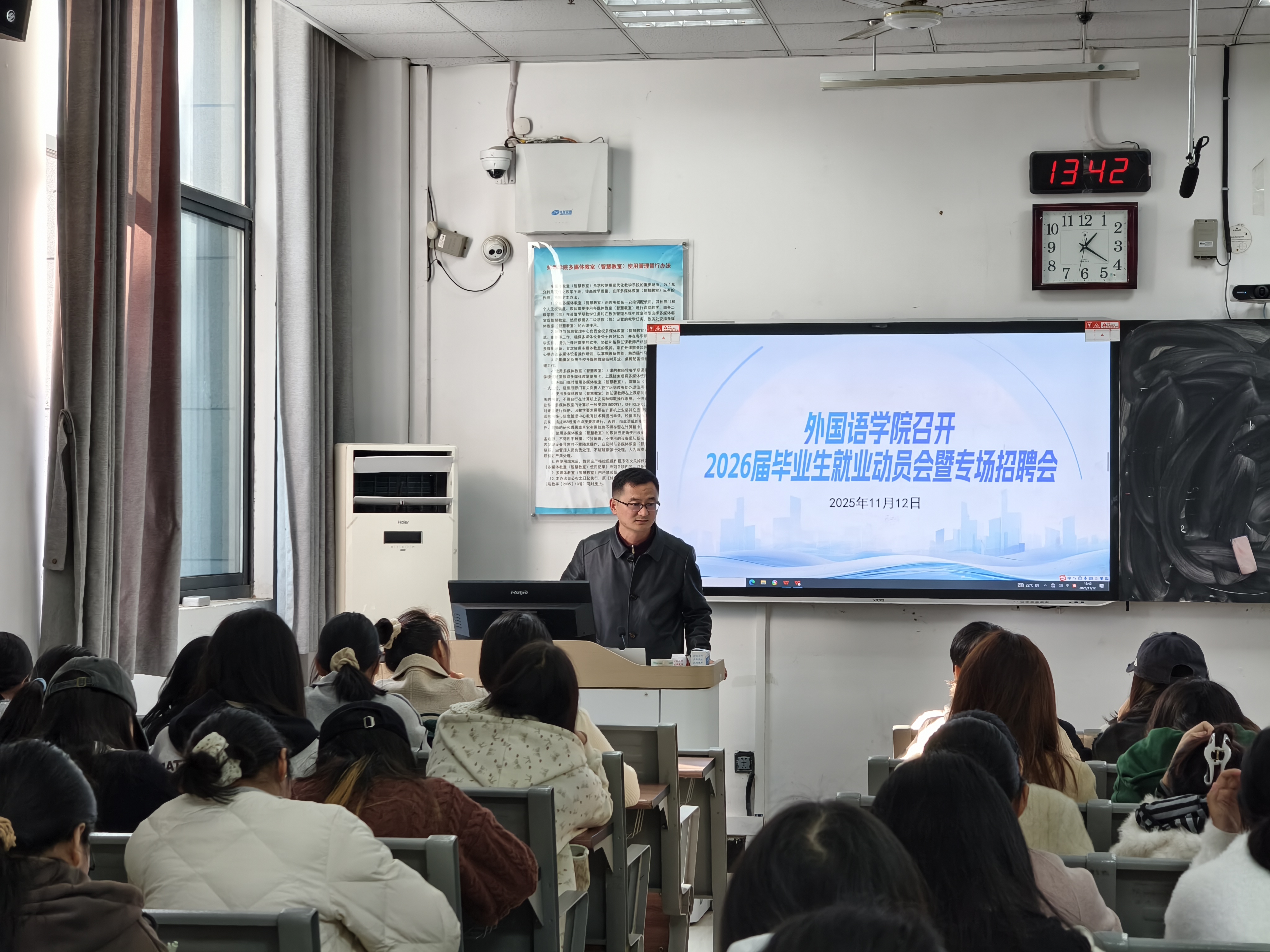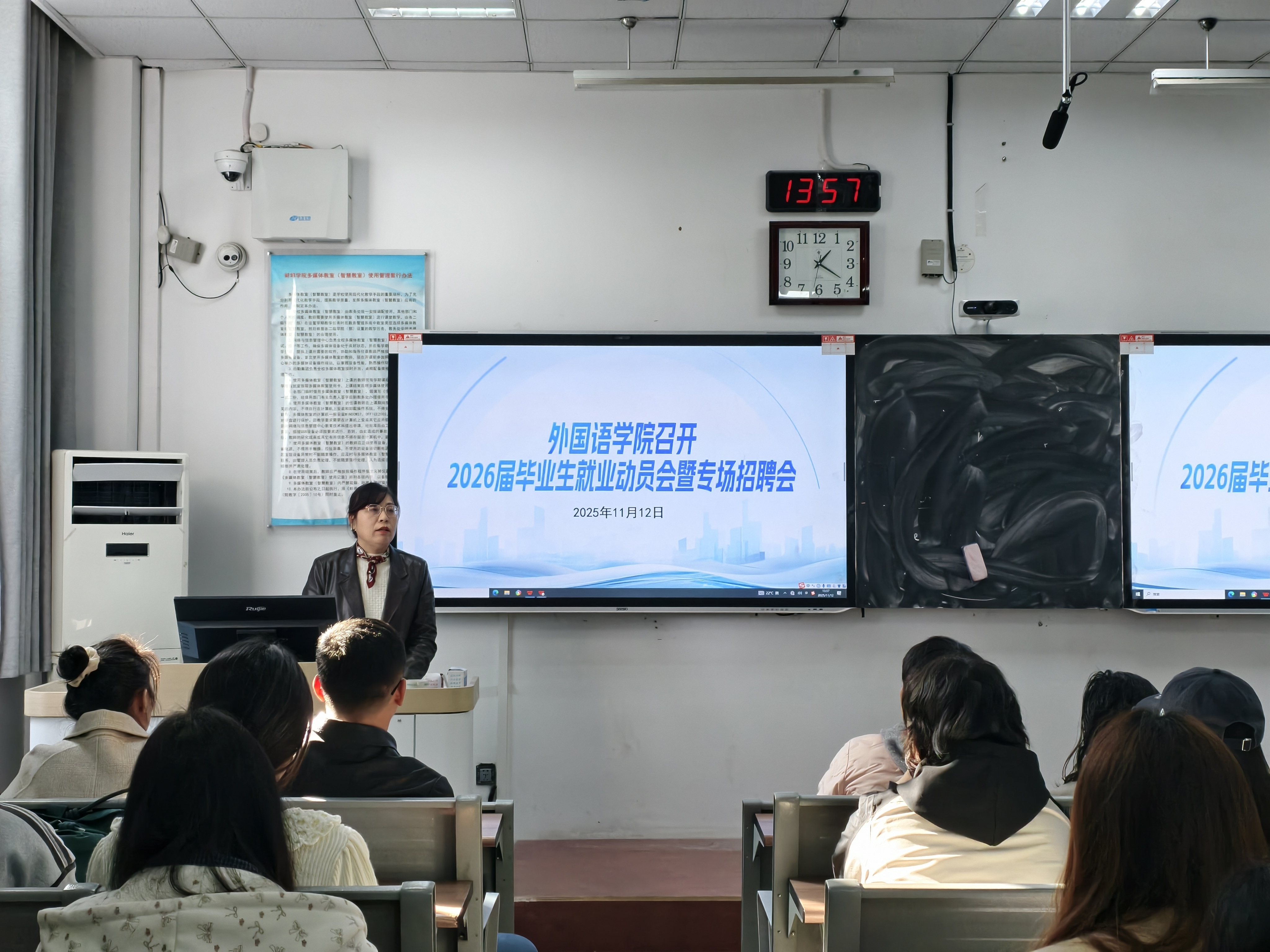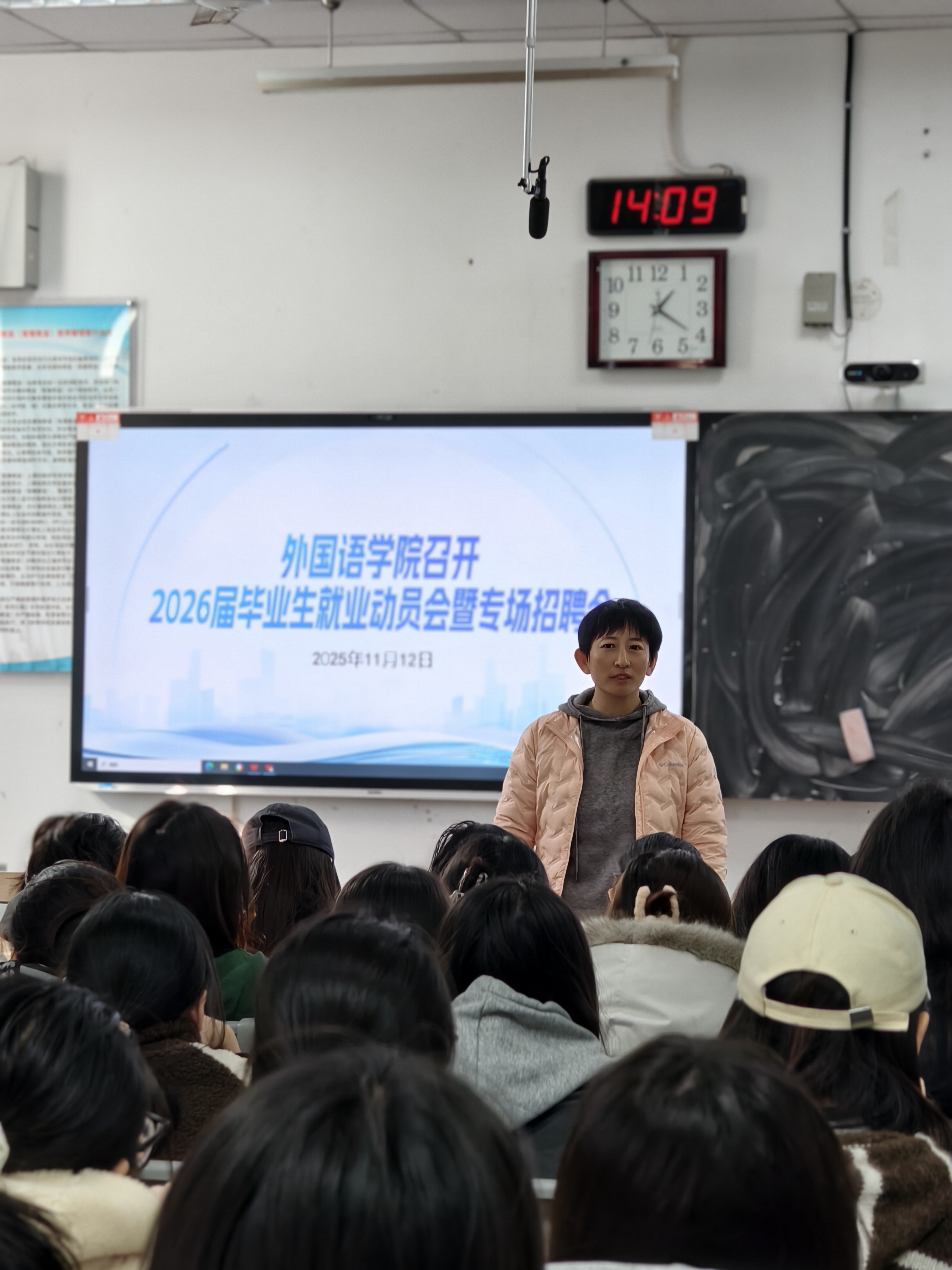 随后,党委副书记周颖针对2026届英语专业毕业生就业指出:当前传统岗位裁员、AI替代等问题,让纯语言竞争力大幅弱化,就业挑战严峻;但跨境电商等新兴领域存机遇,毕业生转型跨境电商、外贸协调的案例,印证“复合价值创造者”更具竞争力。她建议大家拓宽就业视野、锻造“英语+”技能、善用校招平台,鼓励大家以复合能力应对竞争,将语言优势转化为岗位价值,把握时代机遇。