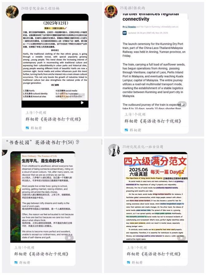 为培养学子英语阅读习惯、提升跨文化人文素养,12月22日,太阳集团tyc539MACAU“书香校园”英语读书打卡活动顺利收官。此次活动以每日打卡的形式,引导学生走进英语阅读的世界,在积累中夯实语言功底,让校园洋溢着浓郁的外语书香。