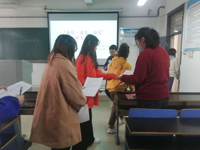 本次活动采用征文和英文演讲双渠道开展。11月22日,“诚信·感恩·励志”征文比赛在C204教室准时启动。征文以感恩家庭、感恩时代为主线面向太阳集团tyc539MACAU全体学生开展,进入决赛的20余篇征文中,同学们以真挚的感情,写家庭、写父母,写时代、谈感恩,真实反映了同学们积极进取,自强自立,诚信感恩的良好精神风貌。