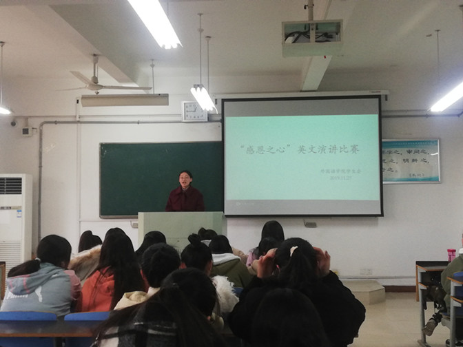 11月27日中午,“感恩之心”英文演讲比赛在教学楼B228教室正式拉开序幕。比赛现场,参赛选手准备充分,精神饱满,用质朴的语言诠释了对亲人、朋友、老师的感恩之情。其中,来自18翻译的曹珺同学以《Thank You—Mom and Dad》讲述父母在生活中对子女无私而伟大的爱。她表示我们要从当下做起,要将感恩付诸行动,并且将父母对我们的牵挂化为力量,更好投入到学习中。来自19英语的王丽同学则从更广阔的视角,号召大家通过感恩身边的人和物,培养感恩意识,常怀感恩之心,常行感恩之事。