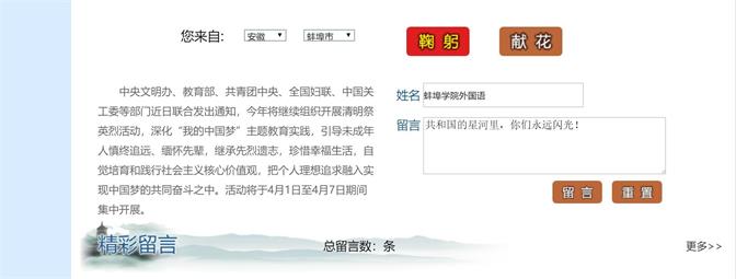 线上缅怀革命先烈虽不能通过现场参观的方式深切感悟革命前辈们浴血奋战的无畏精神,但线上祭扫,进行鞠躬、敬礼、留言等活动,同学们深感历史的足迹跃然眼前,革命先辈的故事萦绕耳畔。同学们表示,通过线上祭扫活动,更加深刻感受“英雄史诗,不朽丰碑”八个大字寓示的革命之火代代相传,深植于血脉深处的红色基因被深深触动。作为当代大学生,一定要牢记勤学报国,用实际行动践行社会主义核心价值观。